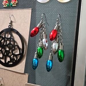 Add a pop of color to your outfit with these vibrant drop earrings. Featuring red, green, blue, and silver tones, these earrings are perfect for any occasion.