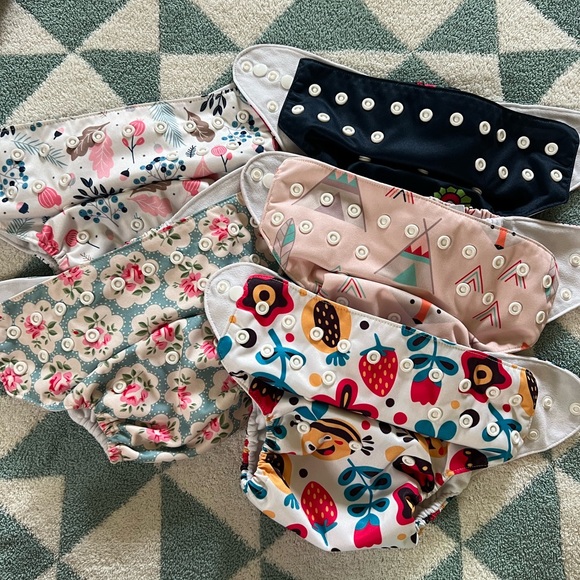 5 cloth diapers and 5 liners, covers are in excellent conditions, liners are in good condition