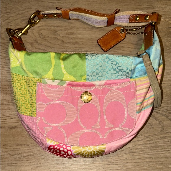 Vibrant and stylish, this colorful patchwork bag is perfect for adding a pop of color to any outfit. Featuring a unique design with shades of pink, green, and blue, it's both fashionable and functional.