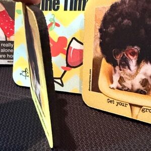 Set of colorful coasters featuring humorous and vibrant designs. Perfect for adding a playful touch to your table setting. 4" x 4"