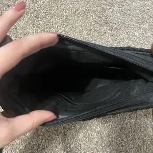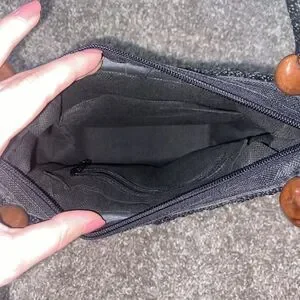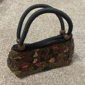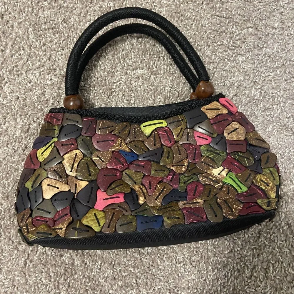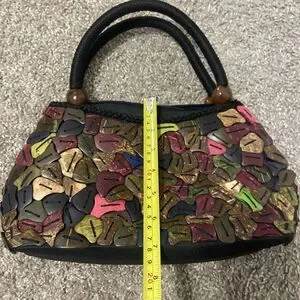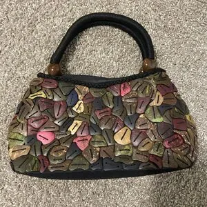 Unique and eye-catching handbag featuring a multicolor textured pattern with abstract shapes, black fabric trim, and double rope handles accented with wooden beads. Spacious enough for your essentials while adding a bold pop to any outfit. In great condition and perfect for everyday use or as a statement accessory.