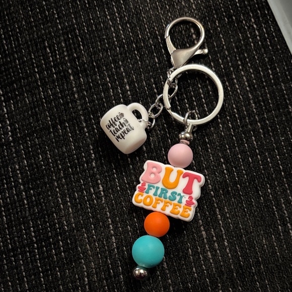 Fun keychain with 'But First Coffee' charm and colorful beads. Perfect for coffee lovers.