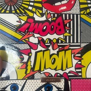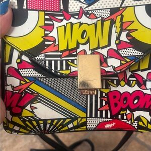 Vibrant crossbody bag in good used condition with comic print design. Features bold colors and a chain strap.