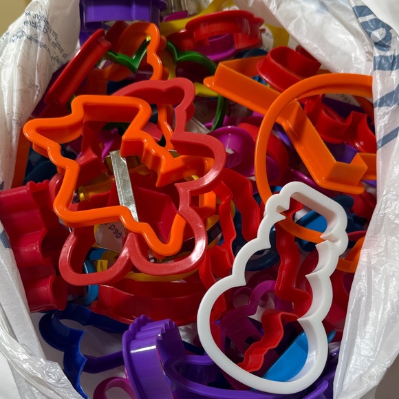 Vibrant set of cookie cutters in various shapes. Includes red, orange, purple, and white cutters. Perfect for baking fun.