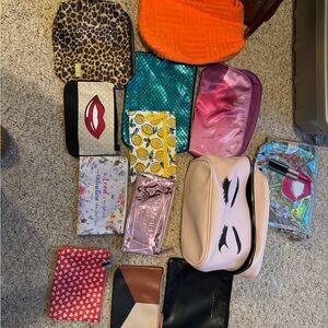 A vibrant collection of cosmetic bags featuring various designs and colors. Includes leopard print, orange, teal, pink, and more. Perfect for organizing your beauty essentials. Open to offers. Open to making a private bundle if you see only a bag or two that you like. These items come from a smoke free home but not a pet free home. There may be pet hair on the items. These bags are used and do you have some wear marks. Some of the bags have lost their shapes. If you would like to see more pictures or have questions, please message me. This would be a great lot for somebody who likes to give free bags with their buyers purchases.