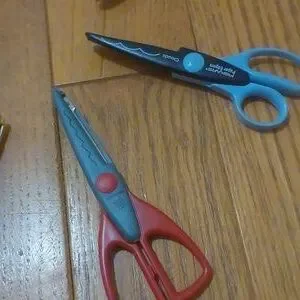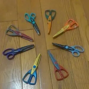 8 pairs of colorful craft scissors cutting a variety of patterns.