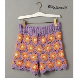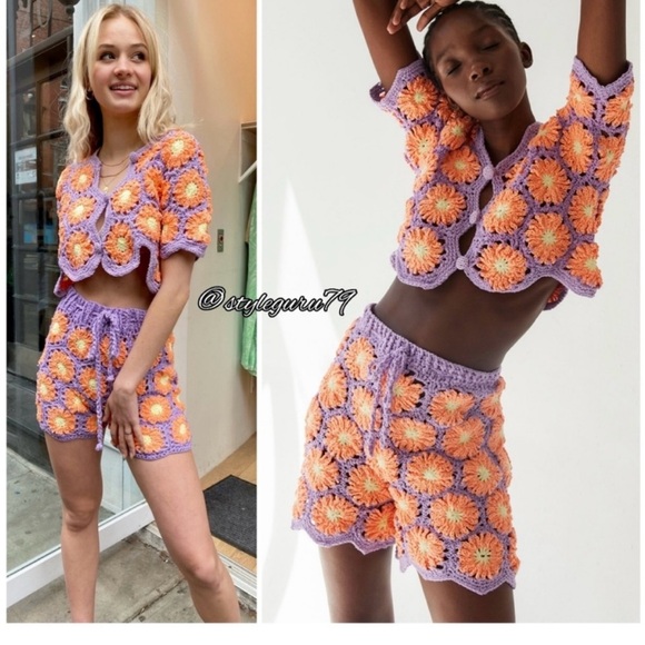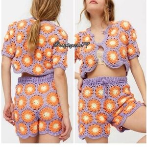 Vibrant hand knit crochet set with floral patterns. Unwashed and unworn. Purchased from another seller for a trip and never wore. I did take tags off. Features orange and purple colors. Perfect for a summer vacay!