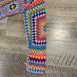 Embrace vibrant style with this colorful crochet fringe cape. Perfect for adding a playful touch to any outfit.