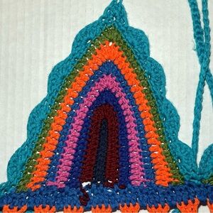 Vibrant crochet halter top with multicolor stripes. Features a tie-back design.