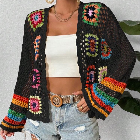 Add a pop of color to your summer wardrobe with this vibrant crochet open-front cardigan with flared sleeves.