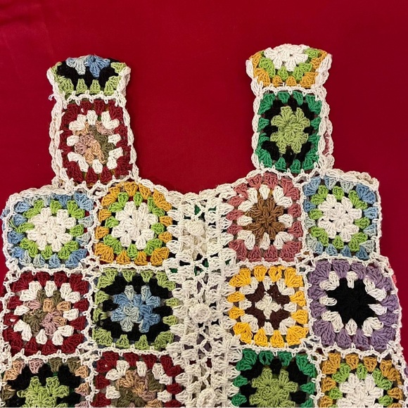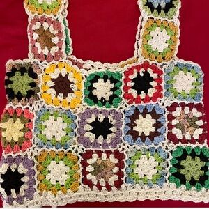 Vibrant crochet patchwork top with multicolor squares. Features shades of green, blue, yellow, and more.