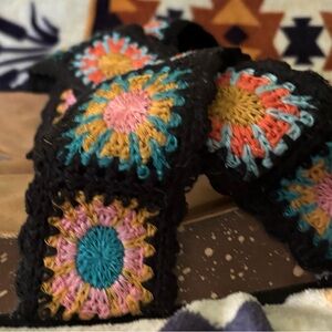 These vibrant black crochet platform sandals feature a colorful floral crisscross design and a comfortable cork-like footbed.