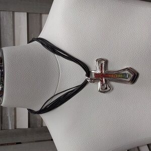 Colorful Cross Pendant Necklace on Multi-Strand Black Cord