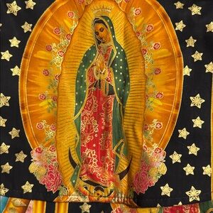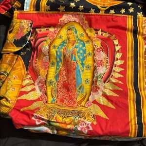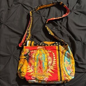 Vibrant crossbody bag featuring a striking religious print. Perfect for adding a pop of color to any outfit.