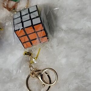 Set of colorful cube keychains. Features red, green, yellow, and blue squares. Perfect for adding a playful touch to your keys or bag. Movable parts just like original Rubix Cube!