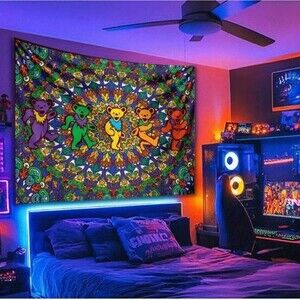 Brighten your space with this vibrant tapestry featuring colorful dancing bears. Perfect for adding a playful touch to any room.
