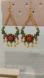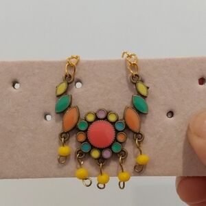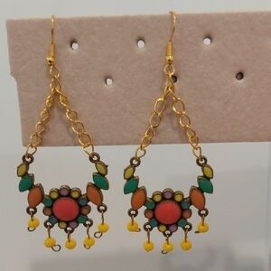 Add a pop of color to your outfit with these vibrant dangle earrings. Featuring a mix of gold, green, orange, and yellow hues, these earrings are perfect for any occasion.