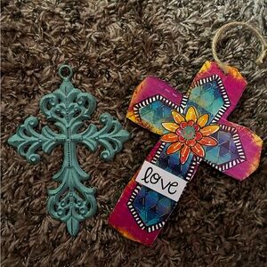 Set of two decorative crosses. One is turquoise with intricate designs. The other is multicolored with a vibrant floral pattern and 'love' text.