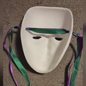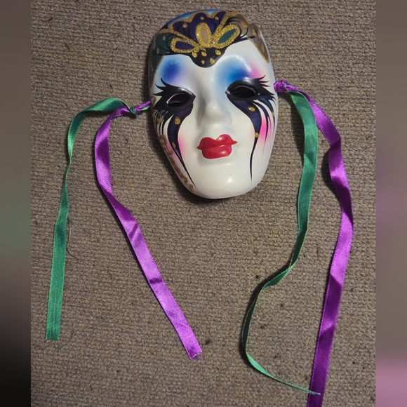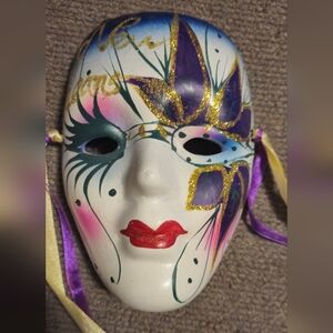 Vibrant decorative mask featuring purple, gold, and red accents. Includes attached ribbons for display.