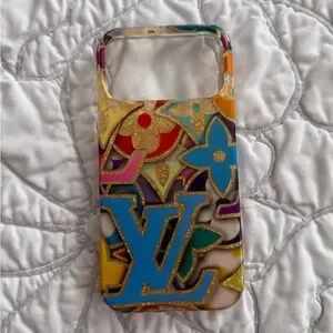Enhance your phone with this vibrant Luis Vuitton inspired design case featuring a mix of blue, yellow, and pink colors. Perfect for adding a stylish touch to your device. Minor scratches. Normal wear and tear.
