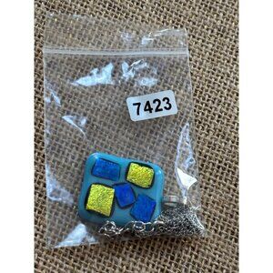 This exquisite pendant necklace showcases a vibrant dichroic glass design, captivating with its stunning interplay of shimmering blues and radiant yellows. The intricate detailing of the glass offers a kaleidoscope of colors, designed to catch the light and the eye. Suspended from a delicate silver chain, this piece is a statement of contemporary elegance, reflecting a harmonious blend of artistry and functionality. A true testament to the beauty of modern jewelry craftsmanship.