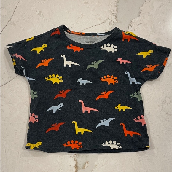 This playful kids tee features a vibrant dinosaur print on a dark background, perfect for everyday fun.