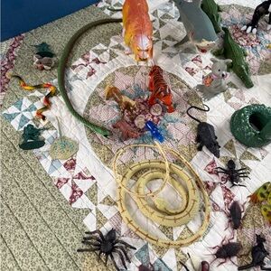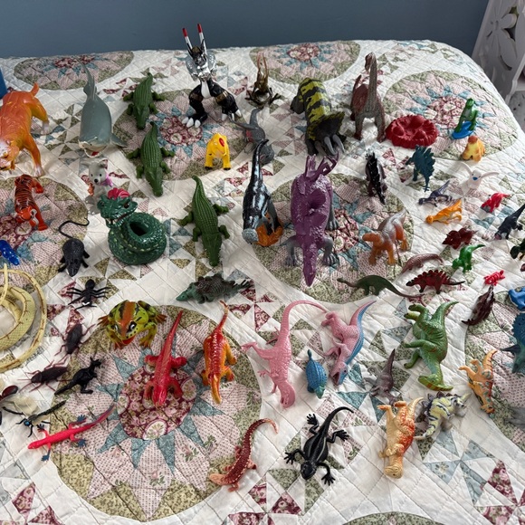 A vibrant collection of dinosaur toys in various colors including green, red, and purple. Perfect for imaginative play. 40 dinosaurs and 36 insects and other animals comes with a storage bin.