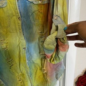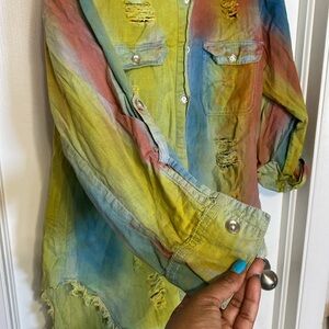 Vibrant distressed button-up shirt with a unique color blend. Features a high-low hem and chest pockets.