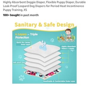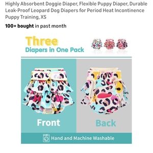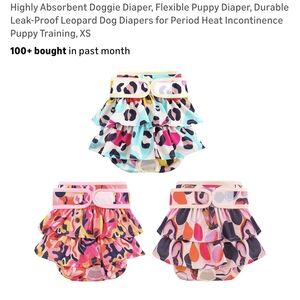 Set of three colorful dog diapers with adjustable straps. Features vibrant patterns in pink, blue, and orange.