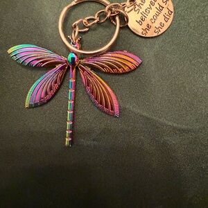 Vibrant dragonfly keychain with a motivational charm. Perfect for adding a pop of color to your keys.