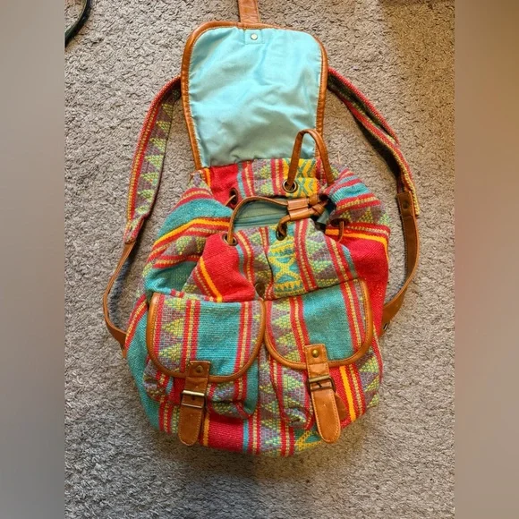 Vibrant and stylish, this colorful backpack is perfect for adding a pop of color to your outfit. Featuring a unique pattern with red and teal hues, it's both functional and fashionable.