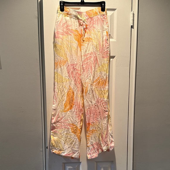 Vibrant pool/beach pants with a drawstring waist. Features a colorful pattern with shades of pink, orange, and yellow. Never worn-smoke free home