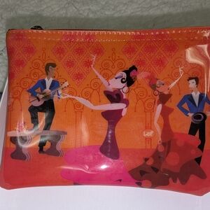 Set of two vibrant drawstring pouches. One features an abstract design in green and cream. The other showcases a lively dance scene in orange and pink.