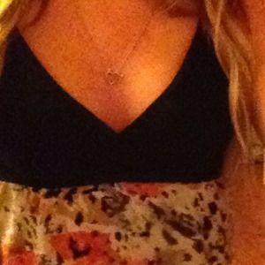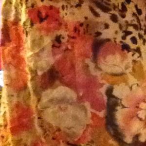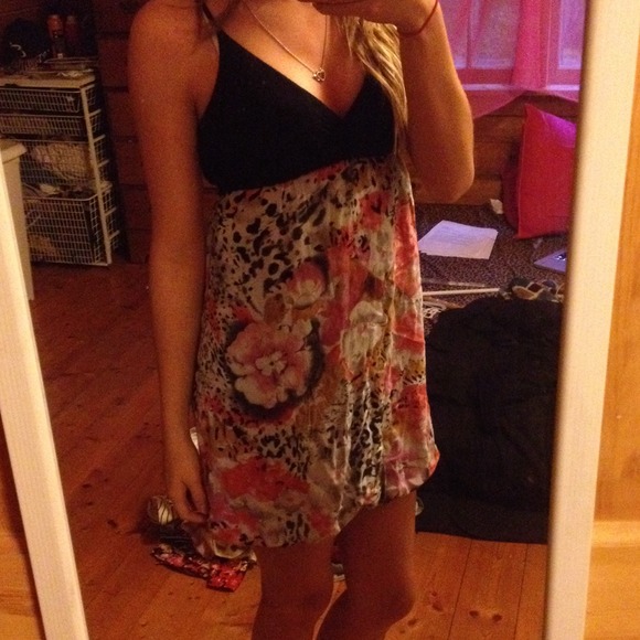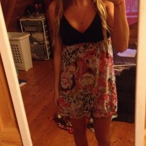 Short cute dress. Top is black with a v-neck. Between design and too is a braided black band. Bottom design consist of flowers looks as if they are painted with watercolor. One of my favorite dresses just have too many. WORN TWICE.