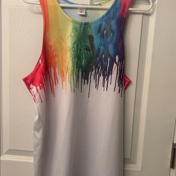 Vibrant tank top with a rainbow drip design. Features red, orange, yellow, green, blue, and purple colors on a white base.