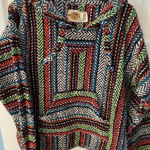 Heavy woven poncho with many colors! Great condition! Has hood and kangaroo pouch