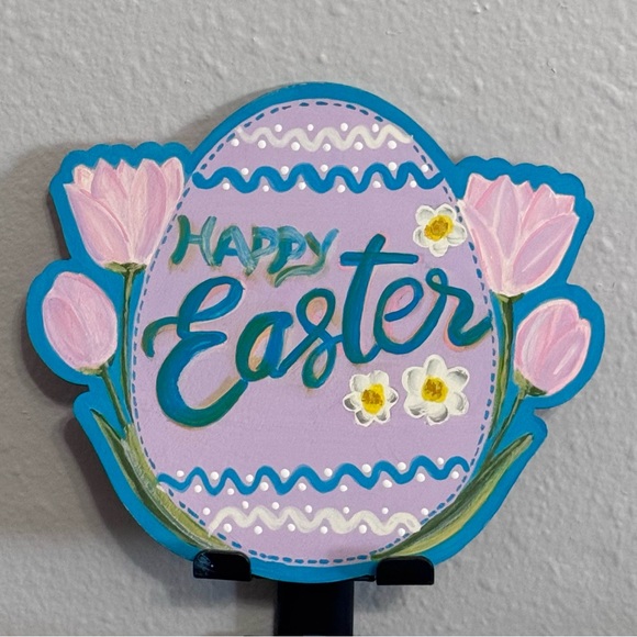 Decorative Easter egg sign with vibrant colors. Features pink flowers and a cheerful message. Handmade Wall Decor/ Art.