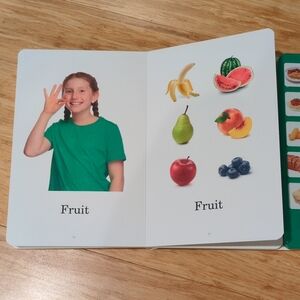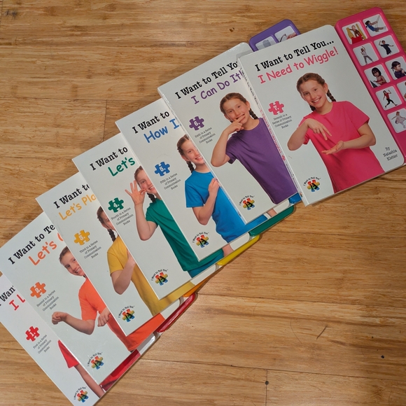 Complete set of seven audio-visual board books by Natashia Kletter for basic AAC, non-speaking communication, early language learners, etc. Photographic illustrations as well as sign language for each word/phrase. Corresponding buttons with matching images read the target words/phrases aloud. Pre-owned in very good condition with minimal use or wear.