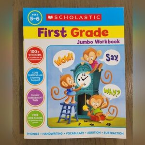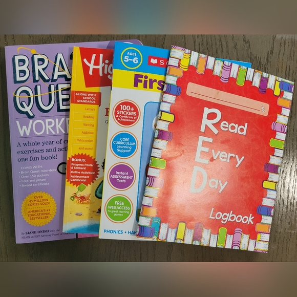 Set of educational workbooks with vibrant covers. Includes phonics and handwriting activities. Perfect for ages 5-6.