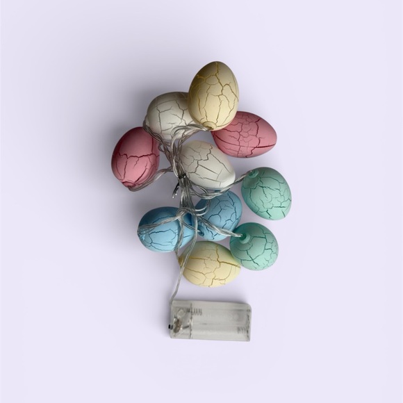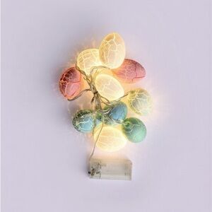 The Easter Egg String Lights are a colorful and festive addition to your holiday or seasonal decor. These string lights feature 10 cracked multicolor egg lights, perfect for celebrating Easter, birthdays, or the arrival of spring. Battery-operated, these modern-style lights can be used both indoors and outdoors.