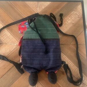 Vibrant elephant-shaped backpack with multicolored patchwork design. Features adjustable black straps.