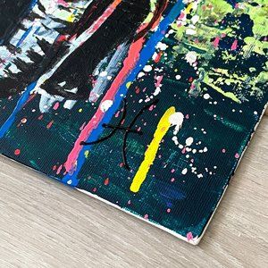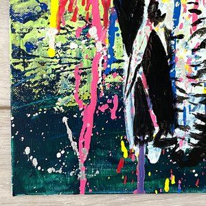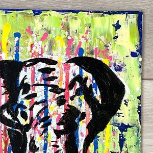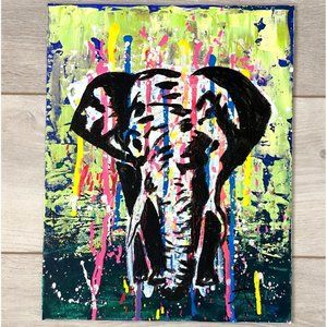 “Colorful Elephant” is an exciting drip and spatter painting of Yellow, Green, Pink, Blue and Silver acrylic and oil paints by artist Tristina Dietz Elmes.