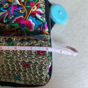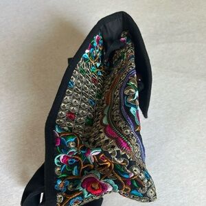 Vibrant embroidered bag with floral patterns. Features a mix of colors including pink, green, blue, and gold on a black background. About 8 inches wide and 11 inches tall