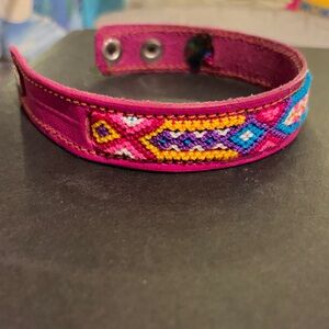 Vibrant embroidered bracelet featuring pink, blue, and yellow hues. Perfect for adding a pop of color to any outfit.