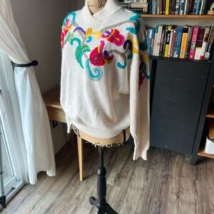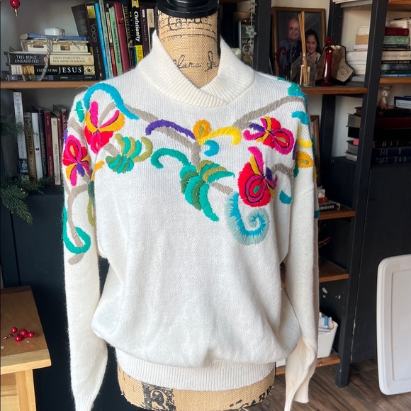 Vibrant cowl neck sweater with colorful embroidery. Perfect for a stylish and cozy look.
