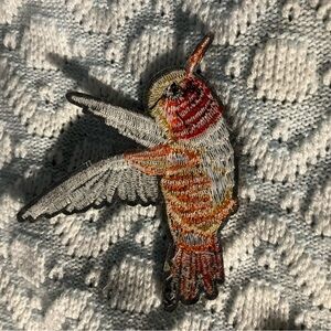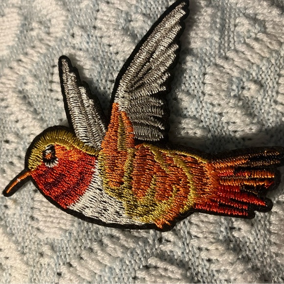Enhance your accessories with this vibrant embroidered bird patch. Featuring a mix of orange, yellow, and white colors, this patch adds a lively touch to any bird-themed item.