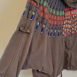 Unique jacket with vibrant embroidery. Features multicolor patterns on a brown base. Perfect for adding a pop of color to your wardrobe.