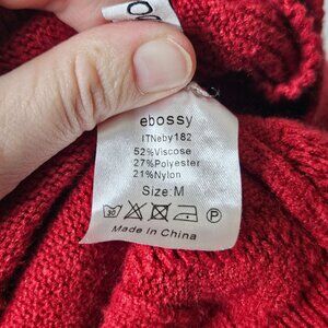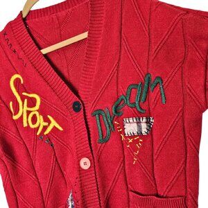 Colorful Embroidered Patchwork Red Cardigan Sweater Button Front Pockets Size M