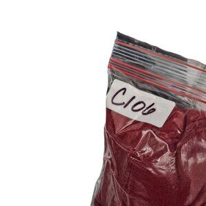 • Vivid red with intricate embroidered lettering and patchwork accents