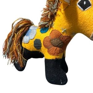 Vibrant plush donkey with floral embroidery. Features yellow, black, and multicolor accents.